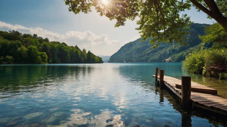Beautiful view of the lake with mountains in the background and blue sky