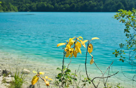 Crystal water and yellow flowers, Plitvice Lakes in Croatia, National Park