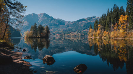 Experience the beauty of a tranquil autumn landscape featuring a mirror-like lake surrounded by majestic mountains and vibrant foliage under a clear blue sky.