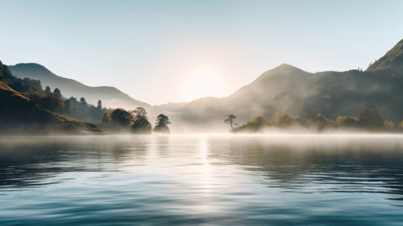 Misty lake landscape with sunrise and mountain background