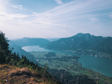 Panoramic view from Schafberg monutain to Mondsee, Austrian Alps, next to Sankt Wolfgang im Salzkammergut