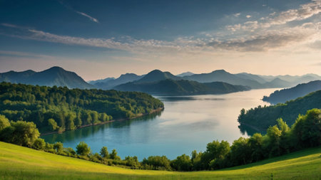 Green hills view with lake and blue sky