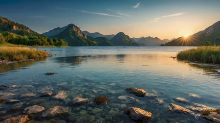 Mountain lake at sunrise. Beautiful summer landscape with lake and mountains