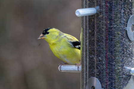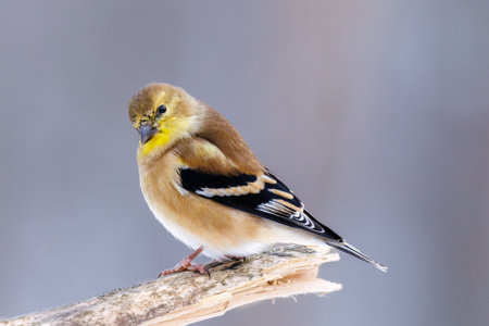 Close up of an American Goldfinch (Spinus tristis) perched on a branch during winter in Wisconsin. Selective focus, background blur and foreground blur.