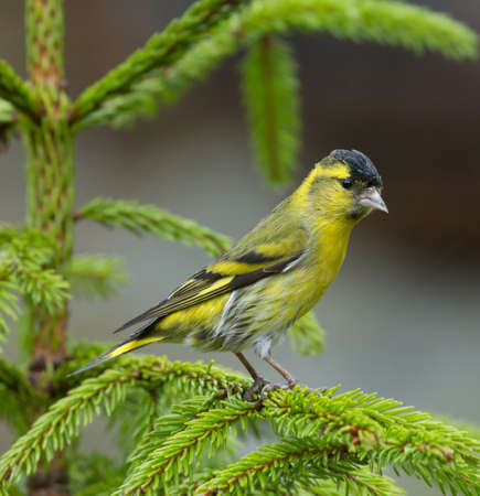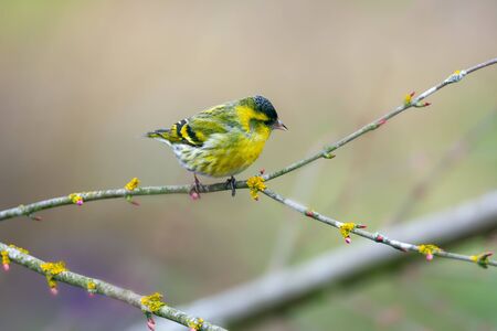 Eurasian siskin (Spinus spinus) small passerine bird sitting on branch