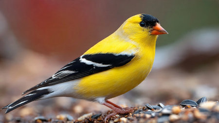 Vibrant yellow bird with black and white wings and orange beak on brown seeds
