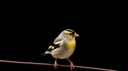A small yellow and black songbird sat on a tree branch, its bright eye scanning the surroundings. Its beak opened to sing a beautiful tune, its tail feathers flickering as it perched on a twig