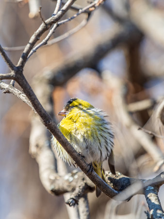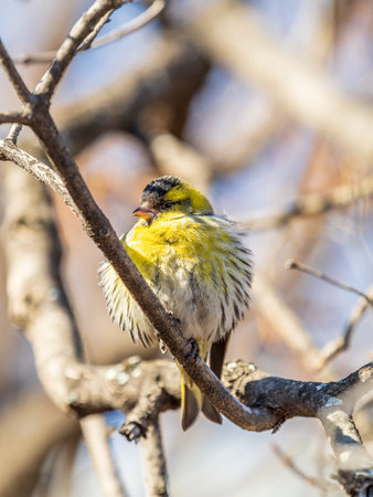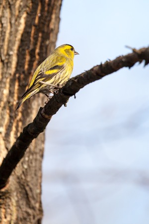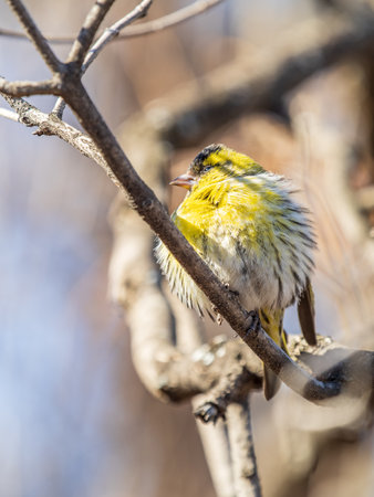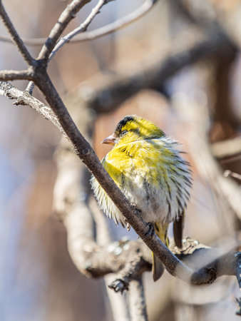 Selective focus photo. Siskin bird on tree. Spinus spinus.