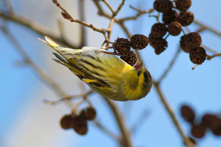 Common Siskin Carduelis spinus feeding with birch seeds