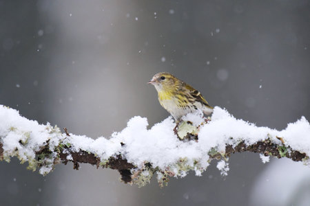 Eurasian siskin (Spinus spinus) female in snowfall sitting on a branch in early spring.