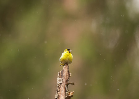Eurasian Siskin (Carduelis spinus). Yellow bird drinking from shallow pond, clear background. Wildlife scene in the nature. Netherlands