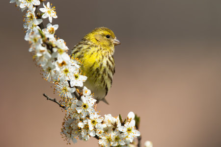 Female european serin, serinus serinus, sitting on a cherry twig in blossom in springtime. Songbird with yellow feathers on a blooming branch in garden illuminated by morning sun with copy space.