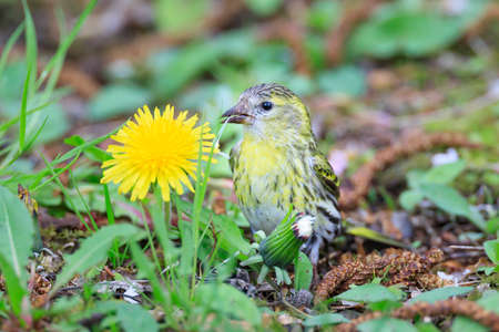 Seed-eating siskin and dandelion flowers
