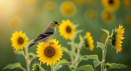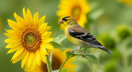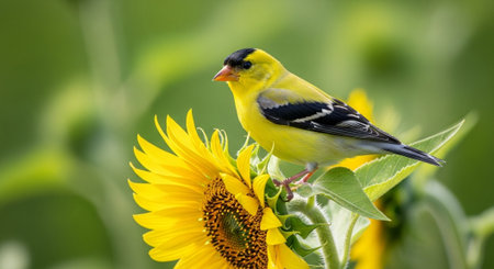 American Goldfinch perched on a vibrant sunflower in summer
