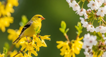 Vibrant yellow finch perched on a blossoming branch in springtime.
