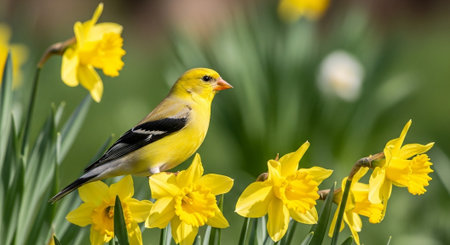 American Goldfinch perched on Daffodils in spring sunshine