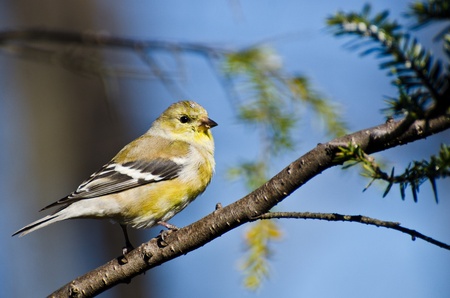 Female American Goldfinch Perched in an Evergreen