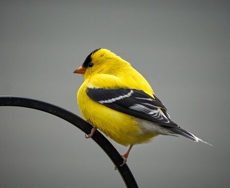 Yellow Finch sitting on edge of an outdoor bird feeder and looking at camera