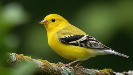 A small, yellow bird is perched on a branch, showcasing bright plumage. The image features a close-up composition with soft focus in the background, primarily green hues. The bird is the central focus with detailed feather textures and a blurred setting. Suitable for various editorial and commercial projects.