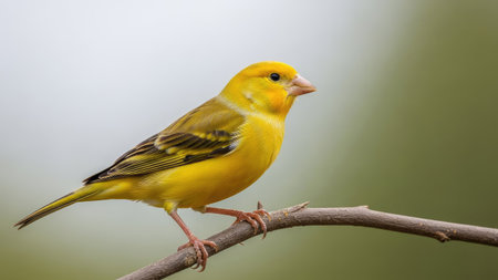 A bright yellow bird is showcased perched on a slender branch, its feathers displaying shades of yellow and green. The composition highlights the bird's detailed features and sharp focus. The soft background adds a gentle contrast, suggesting a natural environment with potential use in various design projects.