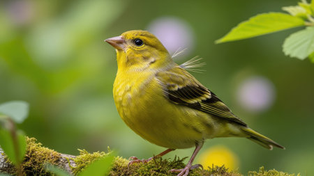 A small yellow bird is perched on a moss-covered branch, its feathers displaying shades of yellow and green. The bird is set against a soft, blurred background of green foliage. The natural lighting and composition suggest potential use in nature-themed publications or decorative designs.