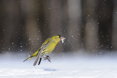Male siskin (Carduelis spinus) in snow. Moscow region, Russia