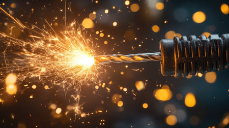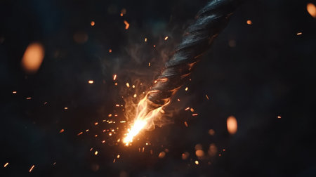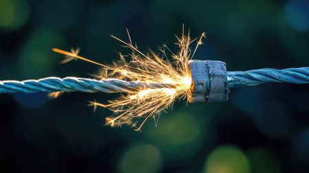 Close-up of a frayed electrical wire with scattered sparks illuminating the darkness, representing danger and electricity. Rich detail and contrast