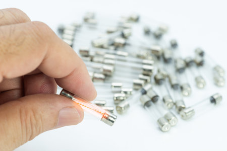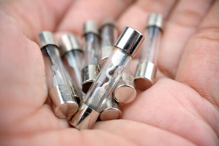 A person holds a glass tube fuse, with several other fuses spread across a white surface in a workshop setting.