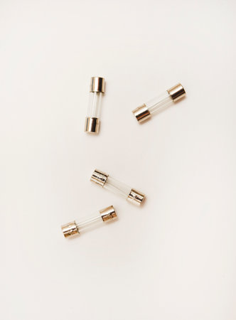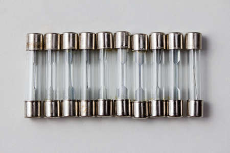 Set of miniature electrical fuses for overcurrent protection in electronics. Safety electronic components group. Metal fusible wire or strip between two terminals enclosed in ceramic or glass tubes.