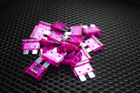 A few pink automotive fuse on the black background. Close-up