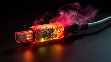 A dynamic image showcasing a USB port releasing energy sparks in a dark setting, surrounded by glowing particles, illustrating the power of modern technology and connectivity.