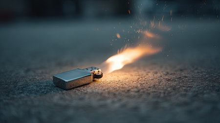 Lighter lying flat on a surface with flame burning sideways, wind-swept effect emphasized