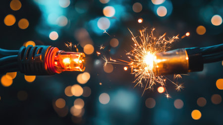 Two exposed cables with bright sparks in a dark setting, representing electrical danger with intense visual drama and realism