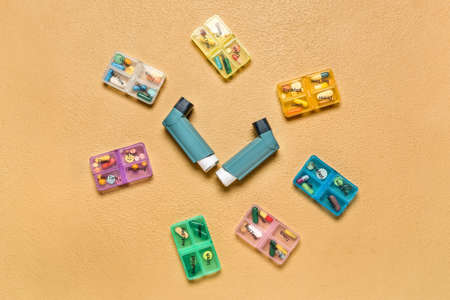 Modern inhalers and pills on color background