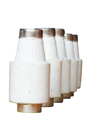 Old type porcelain ceramic safety electric fuses. Electricity problem