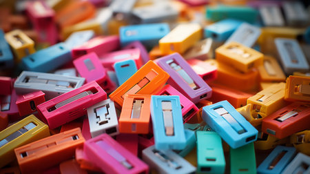 a pile of small plastic colored items resembling microfilm, made of paperclips, showcasing exacting precision. the flat planes and vibrant tones create an eye-catching display. this photo was captured using an olympus xa2 camera, adding a touch of smilecore aesthetic to the composition. ai generated