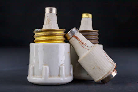 Old ceramic electric fuses. Accessories for the repair of the power network. Dark background.