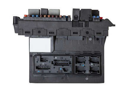 A plastic car engine control unit with metal elements on a white isolated background is the connecting center of various subsystems, units and assemblies. Spare part for repair in a auto service.