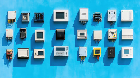 A vibrant display of various electronic devices mounted on a striking blue wall, showcasing the diversity of technology and modern design elements.