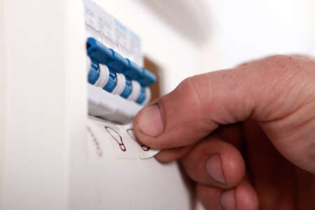 Hand switching power switch on a fusebox. Close up of electrician checking fuse box knob
