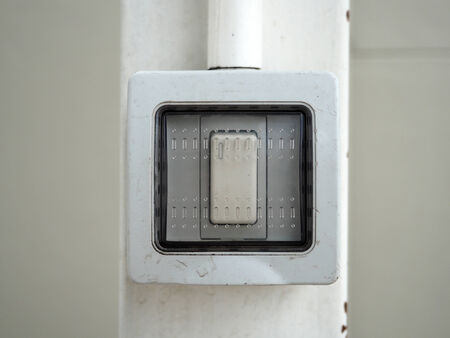 Main electrical switching control for control electrical voltage. General safety duty switch box outdoor with copy space.