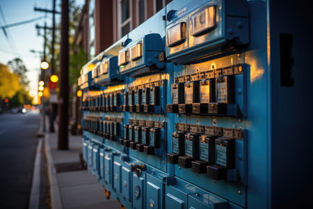 a row of vibrant orange, yellow, blue, and white telephones, reminiscent of the artistic styles of ernest zacharevic, michael vincent manalo, and joseph beuys. the industrial brutalist design is enhanced by intricate circuitry details, while spot metering techniques capture every meticulous aspect of this detail-oriented composition. ai generated