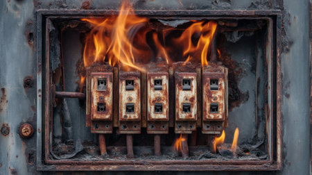 An unsettling image of rusty electrical switches engulfed in flames highlights the potential dangers of neglect and malfunction in industrial settings.