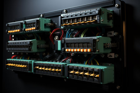 The inner workings of a wiring cabinet display a well-organized arrangement of colorful circuit breakers and fuses. Multiple wires connect neatly, showcasing an effective electrical setup.