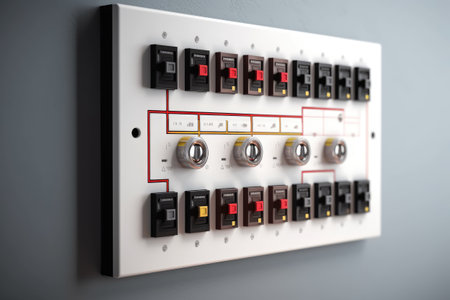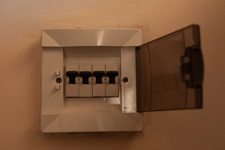 A striking close-up image of an electrical circuit breaker affixed to a wall, showcasing intricate details, soft shadows, and a textured background.