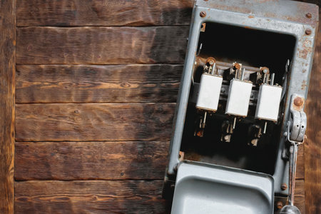 Electric works concept flat lay background with copy space. Old open electric knife switch with fuses on the wooden workbench background