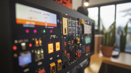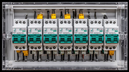 This image showcases an electrical circuit breaker panel featuring multiple switches with clear color coding, designed for safety and accessibility in homes and businesses.