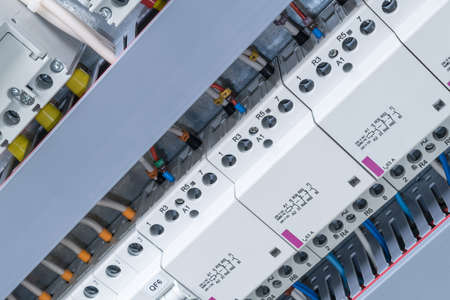 Wires and switches in electric box. Electrical panel with fuses and contactors. Background and texture