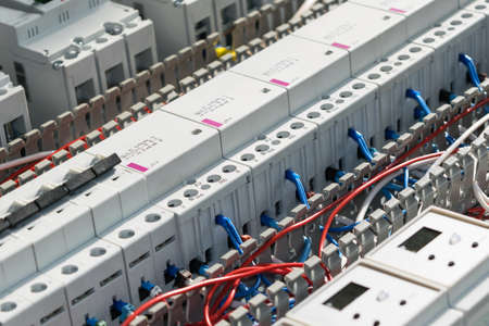 Electrical panel with multi-colored wires. Voltage distributor with circuit breakers. New automated system of electric power supply and distribution. Electric boxes with high-voltage equipment.