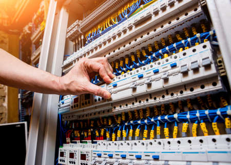 Close up of engineer inspecting voltage at circuit breaker and wiring in power distribution board